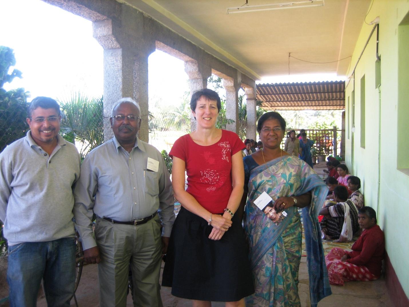 Angela met 3 van de 4 bestuursleden van Vision India: Joby Jacob Varghese, Emerson Samuel en Sarah Joseph. Op de achtergrond zitten de vrouwen te handwerken.