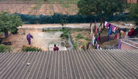 Voorlopig blijft het Abayashram dus waar het is. Voor de korte termijn willen ze graag een hek plaatsen om het stuk grond wat naast het Abayashram ligt. Ook moet daar een waterreservoir komen. De huiseigenaar heeft hen dat ter beschikking gesteld. Dit stuk grond is 3200 square feet. Deze grond gebruiken ze nu al wel, bijv. om de was te drogen. Zie fotootje vanaf de bovenverdieping genomen.