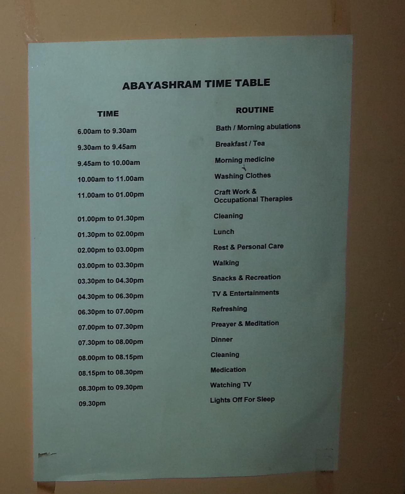 Er geldt een vaste routine in het Abayashram: ‘reinheid, rust en regelmaat’ is het devies in het opvanghuis. Abayashram betekent letterlijk: ‘a place to rest without fear’. Met deze vaste routine komen de vrouwen geleidelijk tot rust.